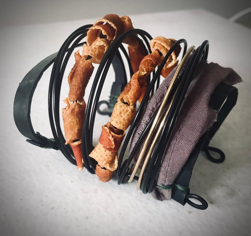 Cuff Bracelet by Stacie Smith, steel & brass wire, bicycle tubes, fabric, dried orange peel beads