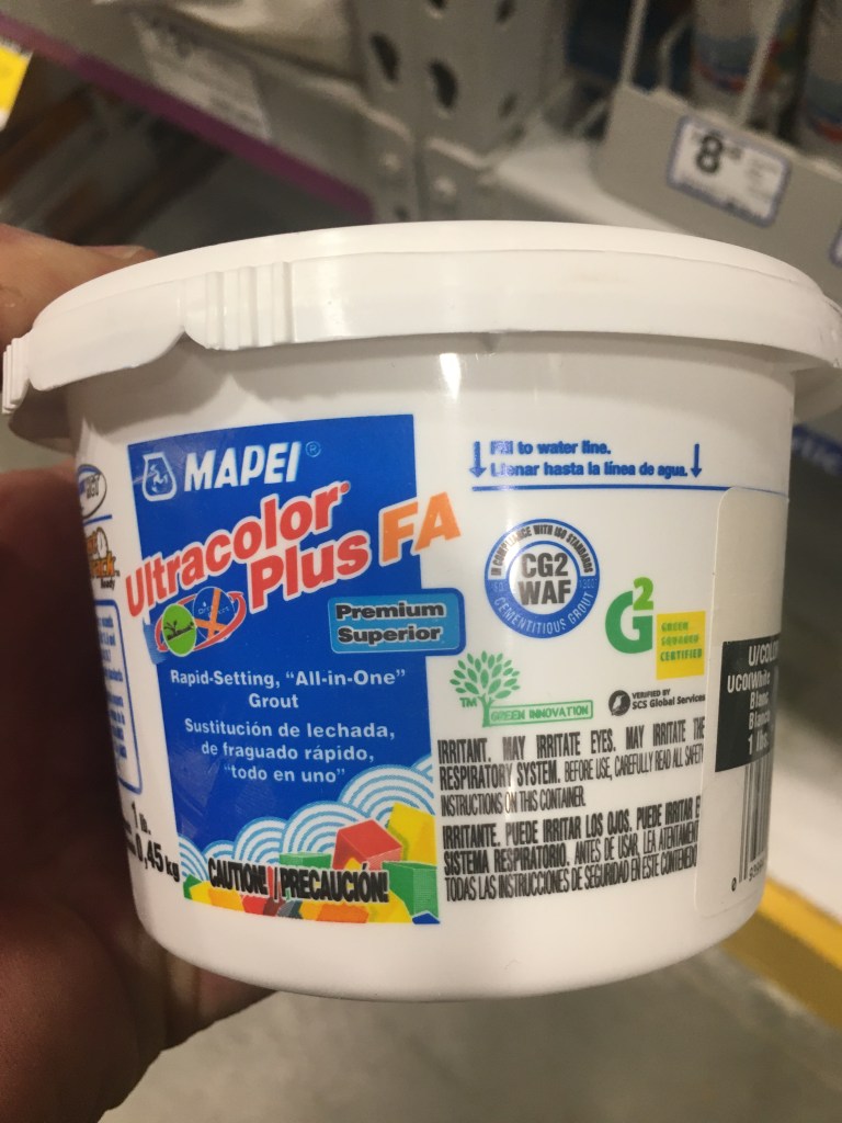 Mapei grout in white, biscuit and warm gray, small tubs for $6 at Lowes