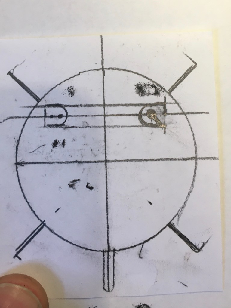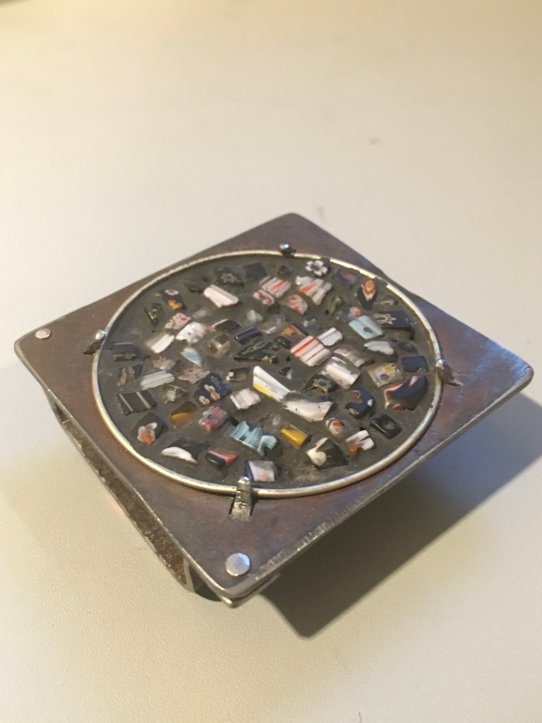 This is a cold-connect-ready pin stem drilled and sawn from sheet using a paper clip wire for the stem, I would attach this to my jar lids before beginning inlay process.